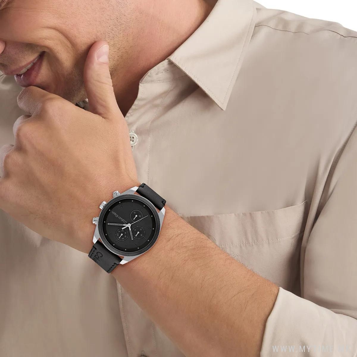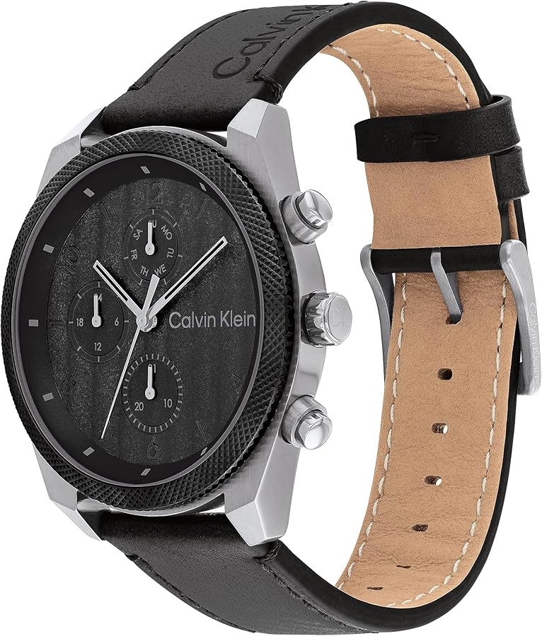 The Calvin Klein Impact 25200364 is a very stylish men’s watch with a 44 mm wide and 10 mm thick stainless steel case in brown colour. This watch features a durable and stylish black leather strap. The black dial of the Calvin Klein 25200364 watch is protected by mineral glass. As a practical feature, the watch features a date dial, where you can find the date and day of the week